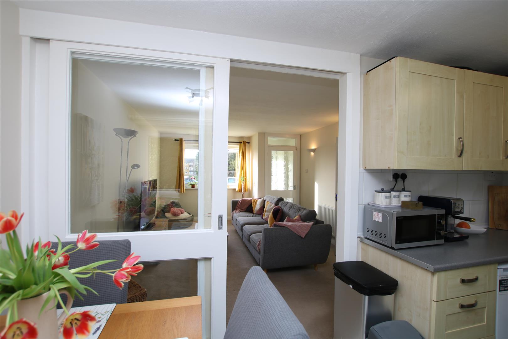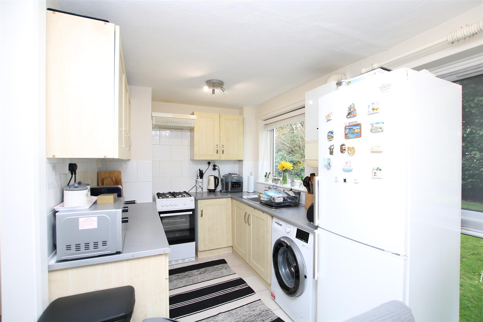 The property is spacious and benefits from direct access to communal gardens, Accommodation comprises: Entrance porch with room to store shoes and coats. The living room features plenty of natural light opens into the kitchen/diner, a sliding door allows the two areas to be kept separate. The kitchen is fitted in a range of wood effect base and eye level units with complementing light grey work tops, space for a free standing cooker, under counter refrigerator and washing machine. Patio doors fitted in the dining area allow access to the communal gardens. Cupboards in the hallway provide plenty of storage options, with one cupboard fitted with power. The master bedroom is a good size and features fitted wardrobes, a further bedroom also benefits from fitted wardrobes. The bathroom is fitted in a white suite with fully tiled area to the bath with shower over, a window provides natural light and ventilation.